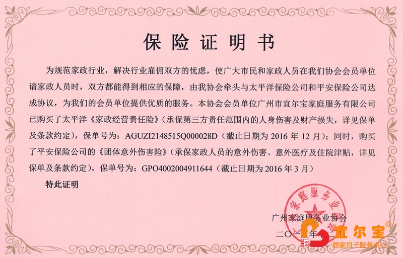 宜爾寶居家月子服務(wù)中心購買了“家政經(jīng)營責(zé)任保險”,宜爾寶的月嫂在從事服務(wù)過程中發(fā)生意外造成客戶人身財產(chǎn)損害,可根據(jù)保單條款給予理賠,每次事故賠償限額高達(dá)一百萬,每次事故財產(chǎn)損失賠償限額高達(dá)10萬,保證每一位來宜爾寶請?jiān)律┑目蛻魝兊那猩砝妗?/span>