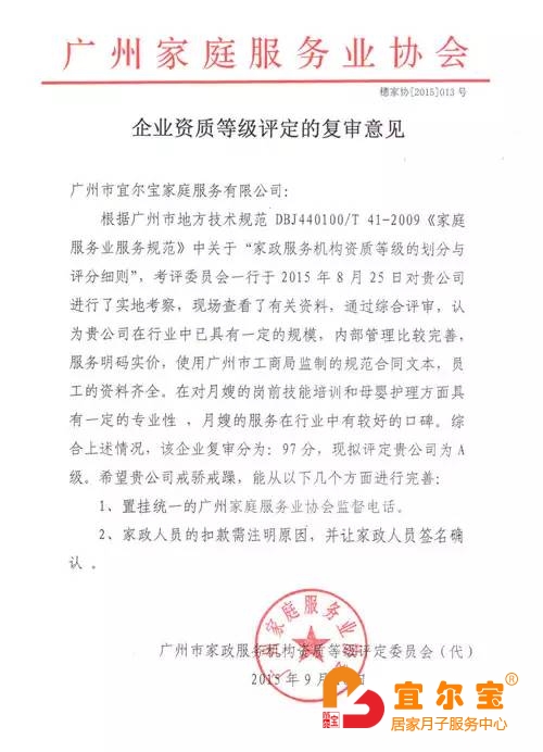 根據(jù)廣州市地方技術(shù)規(guī)范DBJ440100/T 41-2009《家庭服務(wù)業(yè)服務(wù)規(guī)范》中關(guān)于“家政服務(wù)機(jī)構(gòu)資質(zhì)等級(jí)的劃分與評(píng)分細(xì)則”,考評(píng)委員會(huì)一行于2015年8月25日對(duì)宜爾寶月嫂公司進(jìn)行了實(shí)地考察,現(xiàn)場(chǎng)查看了相關(guān)資料,通過(guò)綜合評(píng)審,認(rèn)為宜爾寶月嫂公司在行業(yè)中已具有一定的規(guī)模,內(nèi)部管理比較完善,服務(wù)明碼實(shí)價(jià),使用廣州市工商局監(jiān)制的規(guī)范合同文本,員工的資料齊全。在對(duì)月嫂的崗前技能培訓(xùn)和母嬰護(hù)理方面具有一定的專業(yè)性,月嫂的服務(wù)在行業(yè)中有較好的口碑。因此宜爾寶月嫂公司榮獲《A級(jí)企業(yè)單位》稱號(hào)。