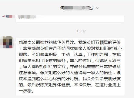 感謝貴公司推薦的林華英月嫂。我給英姐五顆星的評價(jià)!非常感謝英姐在月子期間猶如親人般對我和BB的悉心照顧。英姐做事積極、主動、認(rèn)真,工作能力強(qiáng),在我們家里承擔(dān)了所有的家務(wù),辛苦的付出,但她從無怨言,每天都保持燦爛的笑容,并教會我寶寶的日常護(hù)理及注意事項(xiàng)。像英姐這么好的人值得每一家人的信任,很慶幸遇到這么盡心盡責(zé)的好月嫂。我會介紹給親朋好友的。最后祝愿英姐身體健康、幸??鞓?、在這行業(yè)更上一層樓。