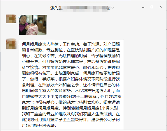 對月嫂:月嫂的服務(wù)質(zhì)量很好,我平時(shí)帶兩個(gè)娃很忙,簡單評價(jià)一下