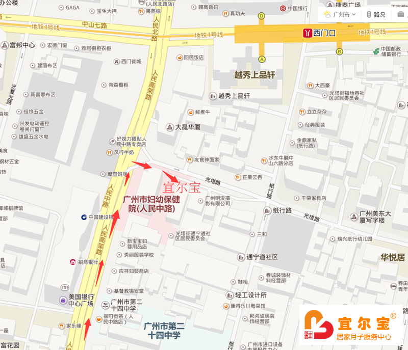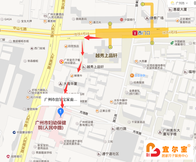 坐地鐵:坐地鐵1號(hào)線到“西門(mén)口”站,A出口左走30米左右,然后再向左走100米左右,即可看到“宜爾寶”如下圖